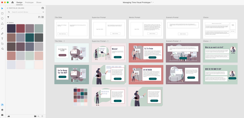 In addition, when developing this project, I gained a much more nuanced understanding of Adobe XD’s role in the course development process. Being able to iterate visual designs quickly saved valuable development time. I am confident that Adobe XD will continue to be useful for visual development and interactive prototyping for future instructional design projects.