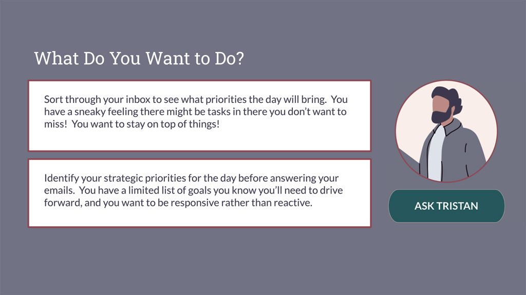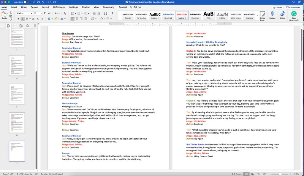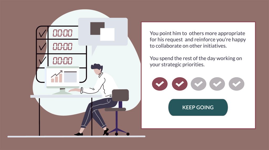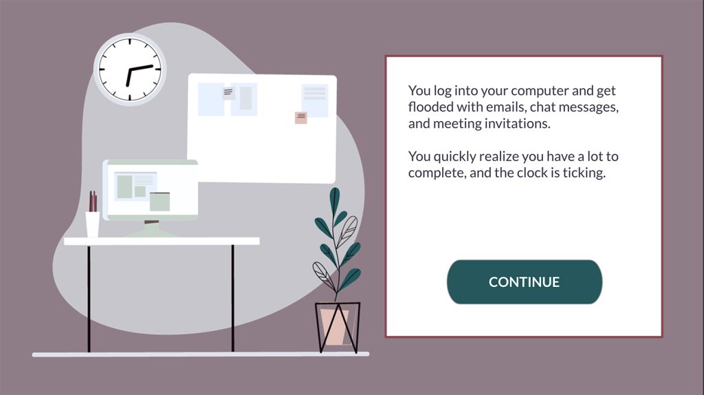 While iterating the storyboard, I incorporated SME feedback into the scenarios, using typical distractors to leverage additional learning. Leaders don’t often understand how habituated choices can undermine their time management abilities. By incorporating the consequences of incorrect decisions, I provided critical, research-based knowledge throughout the eLearning.