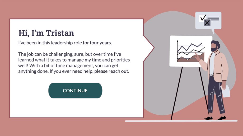 In addition, I incorporated a mentor character, Tristan, within the text-based storyboard. This mentor is an experienced leader, integrated into the eLearning to assist participants throughout all five scenarios. I provided learners access to this mentor character to choose when they needed additional resources throughout the training.
