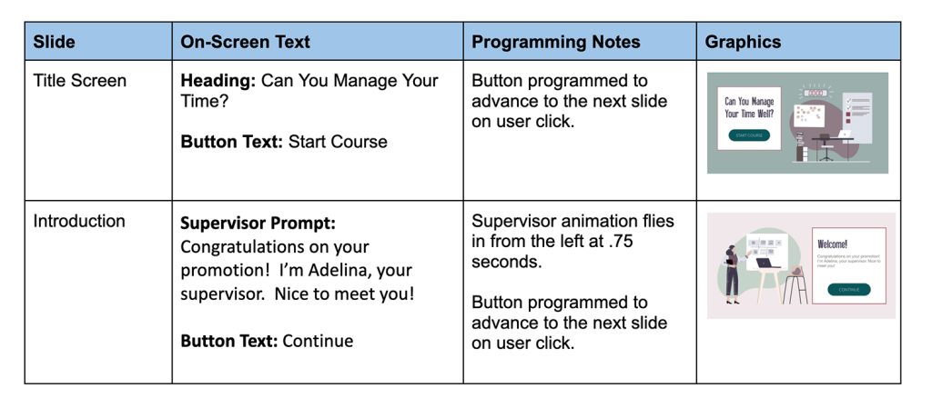Instructional designers can often imagine how eLearning’s text and graphics interact before development. A visual storyboard is helpful in communicating that interaction to SMEs and stakeholders so that they can visualize how the pieces would fit together.
